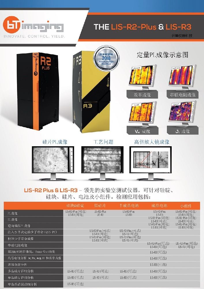LIS-R3是一台全新升级的高级实验室设备,适用于硅块、硅棒、硅片、太阳能电池和小组件。根据多年发展以及不断改进,很多领先的研究机构以及硅片、电池、组件生产商正在使用该设备。主要应用包括工艺改进、实验室研发、工艺调试和根源问题分析、质量保证与质量控制,及安装过程和设备终验收过程的提速。LIS-R3 应用了BT imaging专利的光致发光技术和Rs成像、电致发光成像、偏压PL成像、QSS-PC注入水平决定的少子寿命曲线、校准少子寿命成像、深度的图像处理算法自动得出的硅片和硅碇缺陷参数、Suns-Voc曲线、暗场及光场IV测试,加上LIS-R系列软件更新包的一系列新的分析方法。